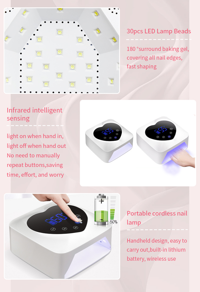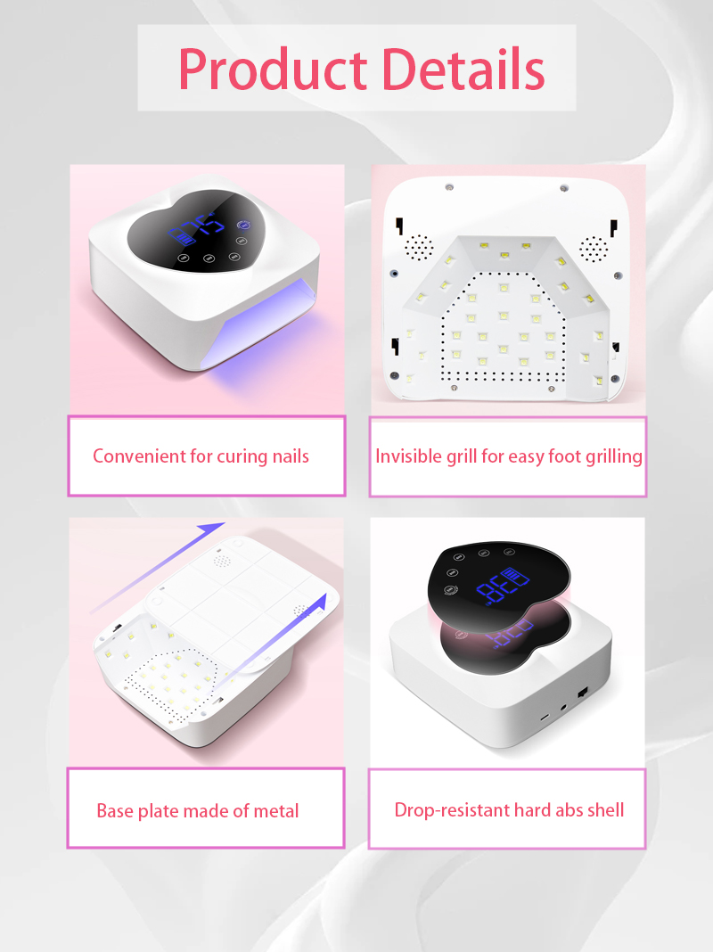 Toode tagab liimi ühtlase kuivamise ilma kokkutõmbumiseta. Selle kaks valgusallikat soojendavad õrnalt, et vältida käte värvimuutust ja silmade väsitamist, mis sobib nii kätele kui jalgadele, pakkudes märkimisväärselt kiireid kuivatustulemusi.