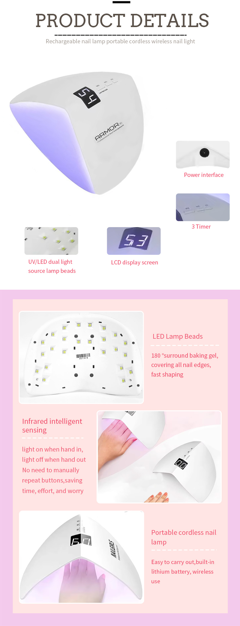Toode tagab isegi liimi kuivamise ilma kokkutõmbumiseta. Selle kahekordsed valgusallikad pakuvad õrna kuumutamist, et vältida käe värvimuutust ja silmade pinget, mis sobib nii käte kui ka jalgade jaoks, pakkudes märkimisväärselt kiireid kuivamise tulemusi.