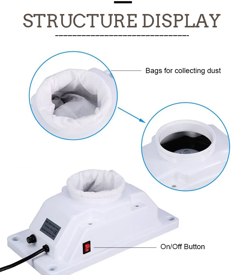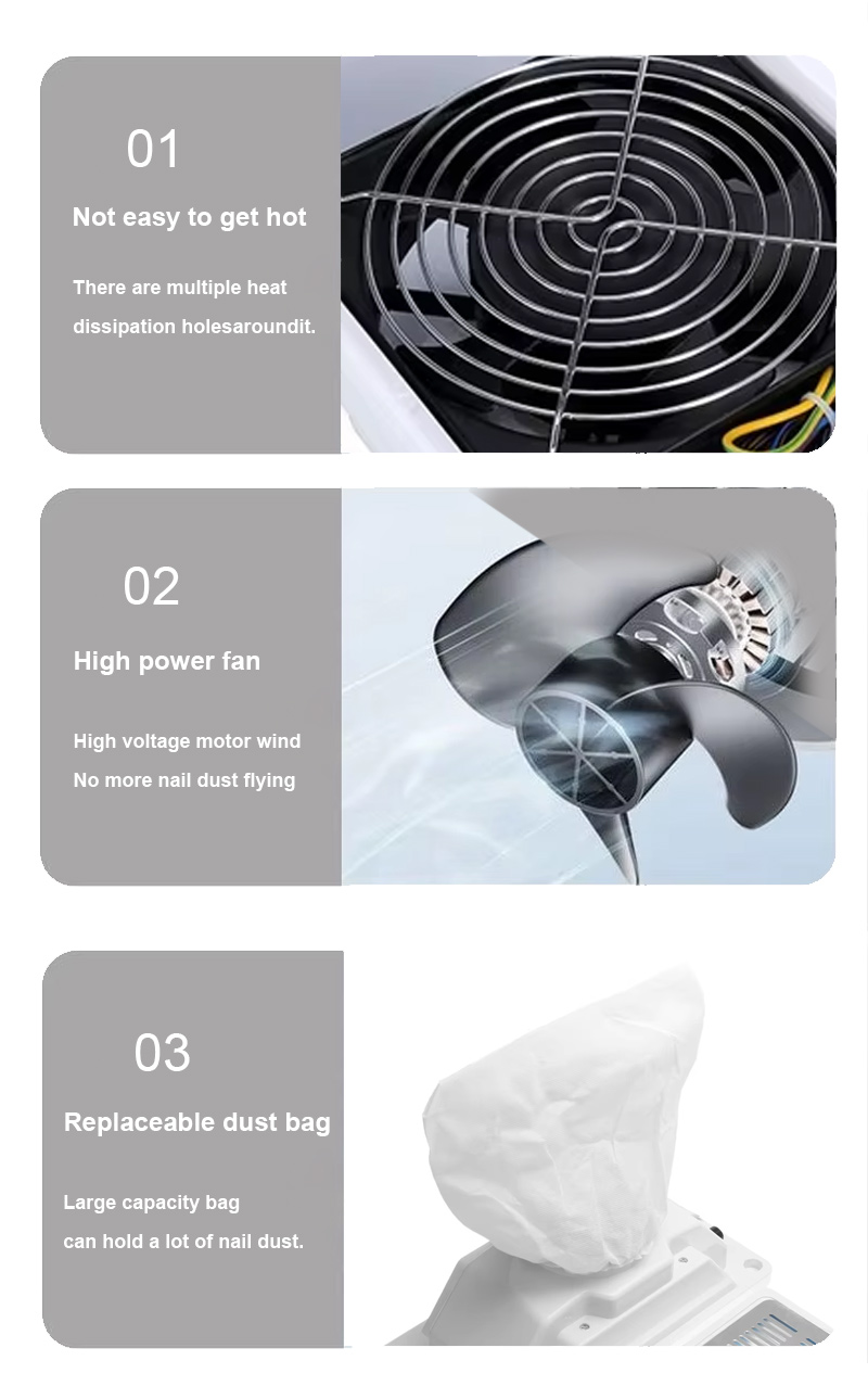 Jah. TheTöölaua sisseehitatud küünte tolmukoguja on spetsiaalselt konstrueeritud nii, et tolmu ei lekiks. 45 W võimas imemisvõimsus koos tõhusa tihendiga sisselaskeala ümber tagab, et tolmuosakesed püütakse kinni allikast, mitte ei põgeneks tagasi tööruumi. Raske akrüülviilimise ajal säilitab seade ühtlase imemisvõime, hoides tööpinnad puhtad ja takistades tolmu levikut õhku. Iga päev mitut akrüülitööd tegevate tehnikute jaoks vähendab see usaldusväärne tolmupüüdur märkimisväärselt kumulatiivset kokkupuudet tolmuga.