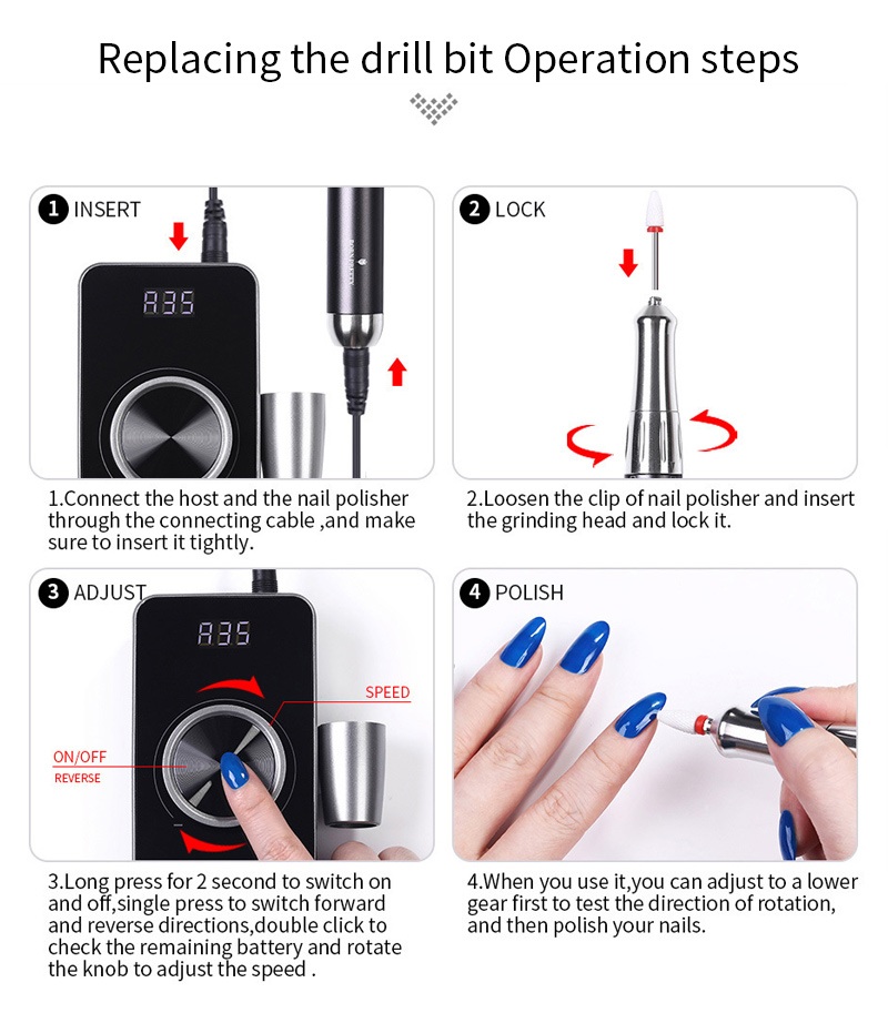 Seda koorivat 35 000 p/min elektrilise küünepuuri asendustrelli töömeetodit, st ühendage ja tõmmake välja, lihtne ja mugav, asendamist saab kasutada pärast lõpetamist.