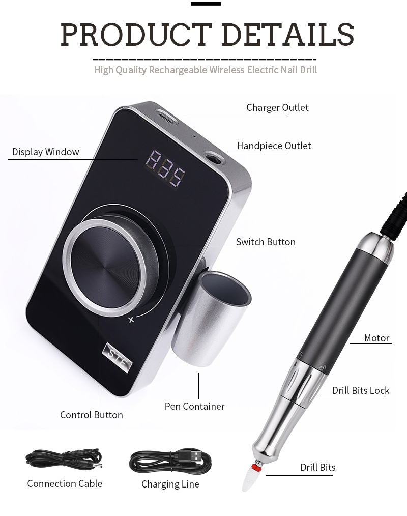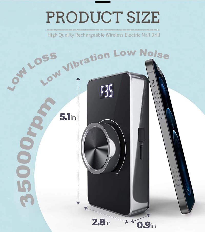 Selle kooriva 35 000 p/min elektrilise küünepuuri ekraanikujunduses on sisse/välja lüliti ja edasi/tagasi pöörlemine ühe nupuga aktiveerimiseks, kiirlaadimispesa allosas, vahetatav puuripesa ülaosas ja kolmes asendis reguleeritav kiirus erinevate vajaduste rahuldamiseks.