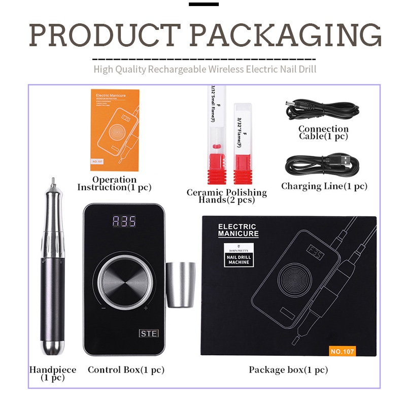 Selle kooriva 35 000 p/min elektrilise naeltrelli pakendi sisus on lihvimispliiatsi toode, USB laadimiskaabel, toote kasutusjuhend ning kerge ja kaasaskantav karp.