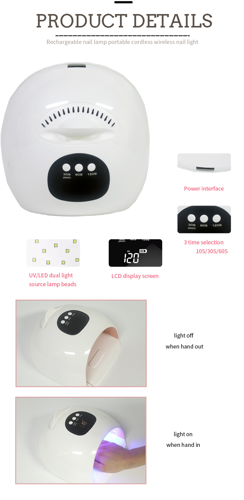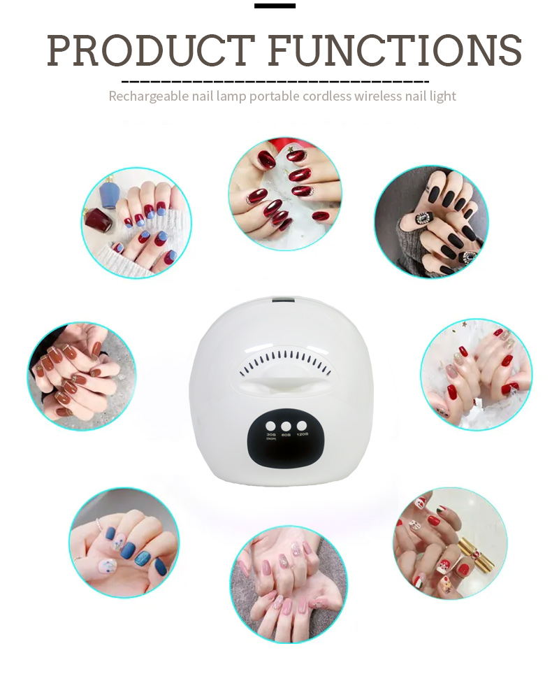 Toode tagab liimi ühtlase kuivamise ilma kokkutõmbumiseta. Selle kaks valgusallikat soojendavad õrnalt, et vältida käte värvimuutust ja silmade väsitamist, mis sobib nii kätele kui jalgadele, pakkudes märkimisväärselt kiireid kuivatustulemusi.