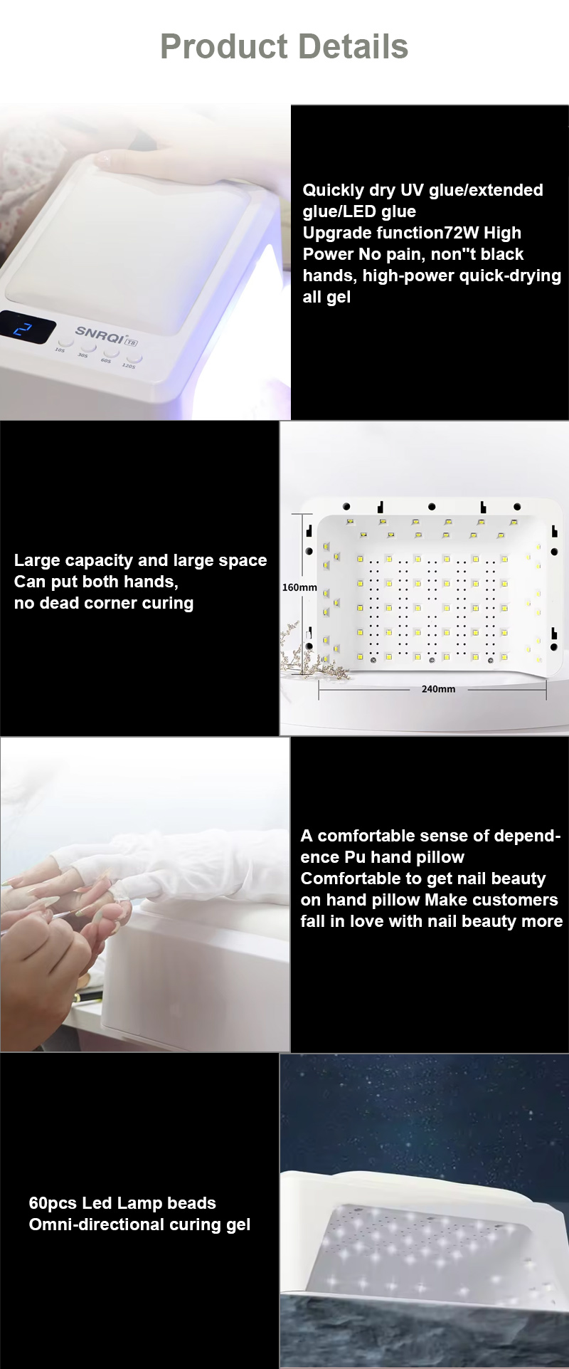 Toode tagab liimi ühtlase kuivamise ilma kokkutõmbumiseta. Selle kaks valgusallikat soojendavad õrnalt, et vältida käte värvimuutust ja silmade väsitamist, mis sobib nii kätele kui jalgadele, pakkudes märkimisväärselt kiireid kuivatustulemusi.