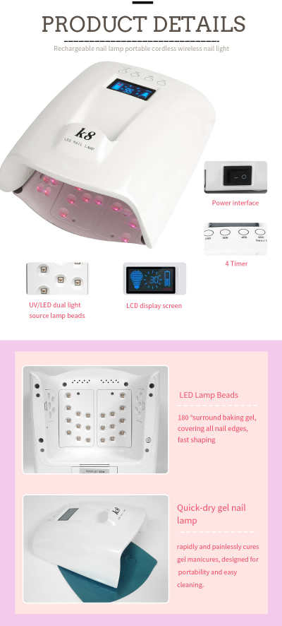 Suure võimsusega käepidemega küünekuivatuslamp tagab liimi ühtlase kuivamise ilma kokkutõmbumiseta. Selle kaks valgusallikat soojendavad õrnalt, et vältida käte värvimuutust ja silmade väsitamist, mis sobib nii kätele kui jalgadele, pakkudes märkimisväärselt kiireid kuivatustulemusi.