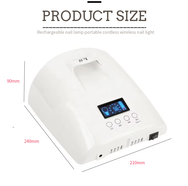 Suure võimsusega käepidemega küünekuivatuslambi mõõtmed on 205 mm pikkused, 220 mm laiused ja 104 mm kõrgused, suure võimsusega ja võimalusega kasutada nii käsi kui jalgu, mis on väga mugav.