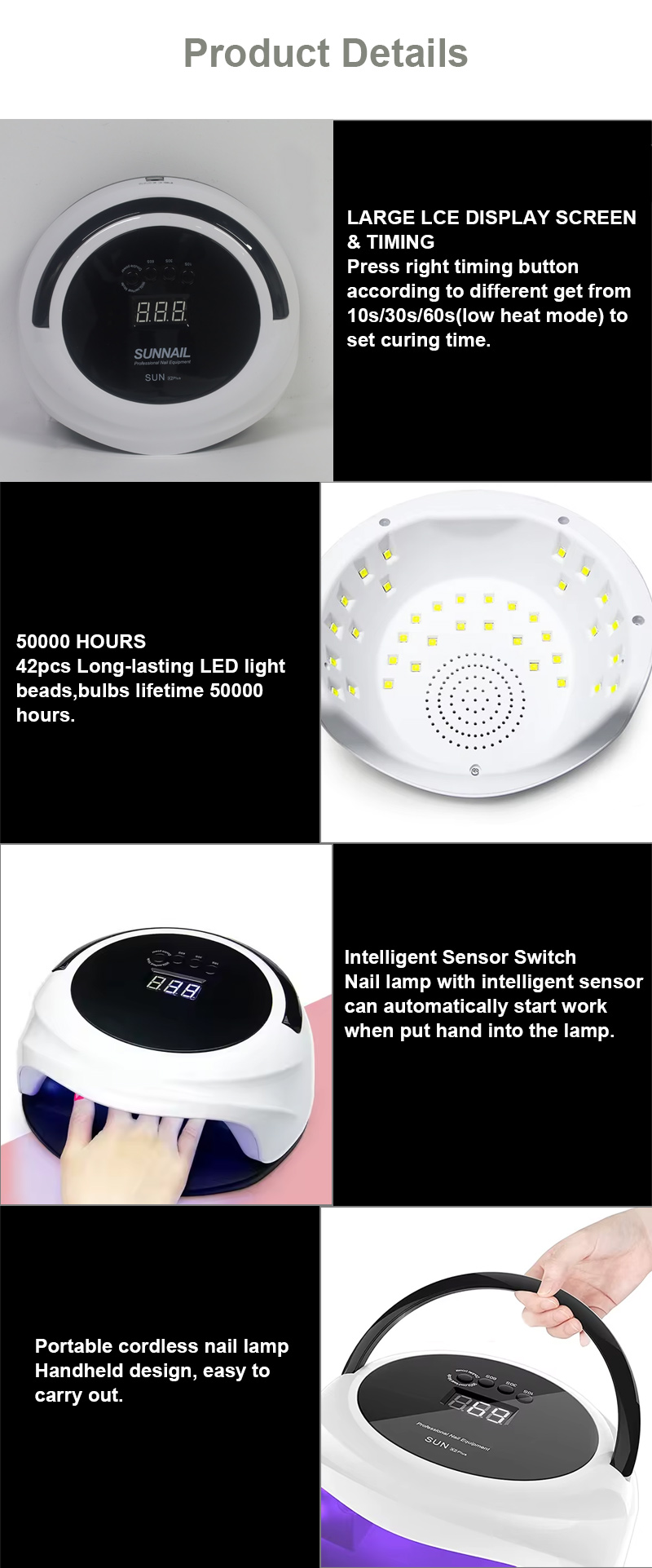 Automaatse anduri funktsiooniga küünekuivatuslamp sisaldab infrapuna-nutitundlikku tehnoloogiat, mis süttib automaatselt, kui käed lähenevad, ja lülitub välja, kui käed eemalduvad – see välistab korduva nuppude vajutamise ning säästab aega ja vaeva. Suure võimsusega küpsetusliim ei nõua pikka ootamist, säästes nii aega kui ka vaeva.