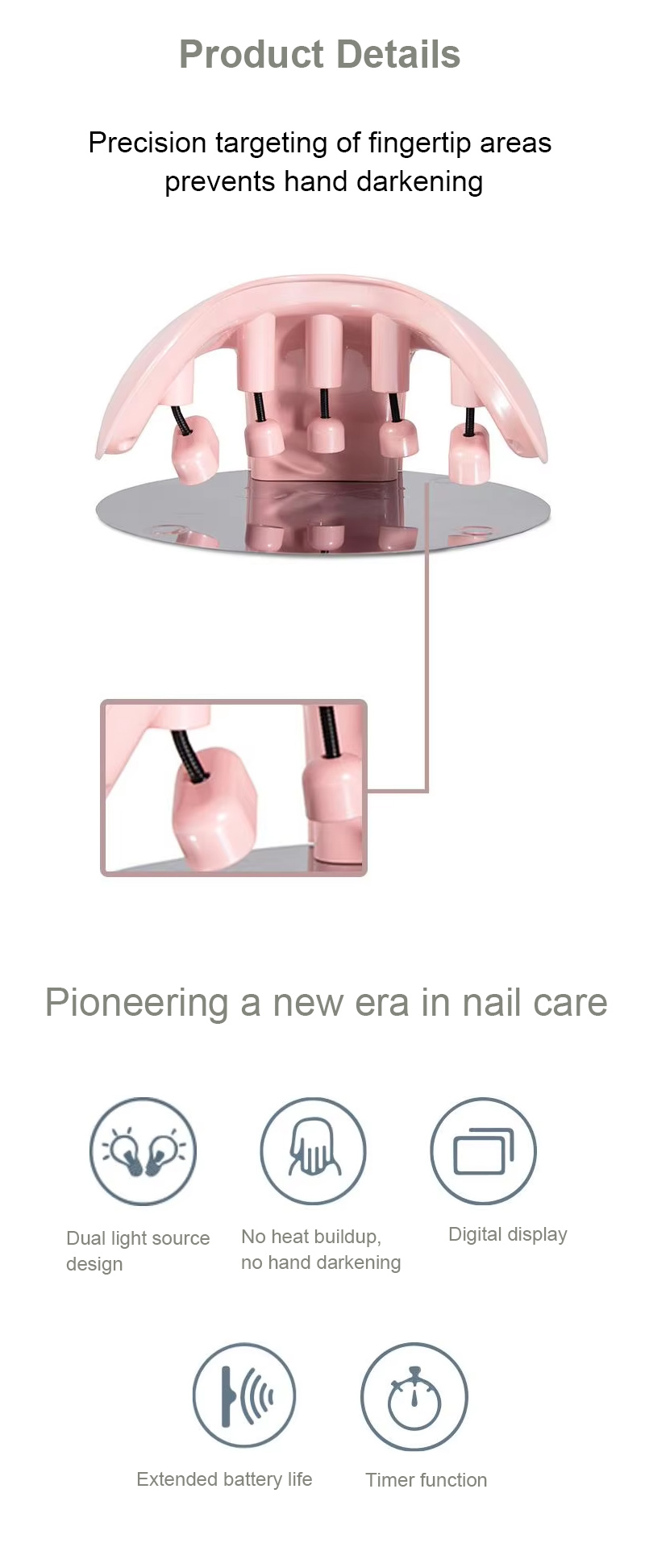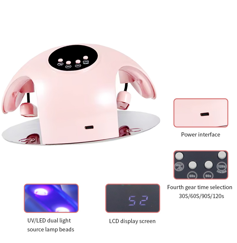 Toode tagab liimi ühtlase kuivamise ilma kokkutõmbumiseta. Selle kaks valgusallikat soojendavad õrnalt, et vältida käte värvimuutust ja silmade väsitamist, mis sobib nii kätele kui jalgadele, pakkudes märkimisväärselt kiireid kuivatustulemusi.