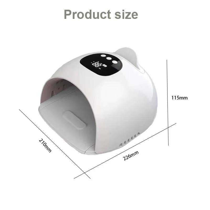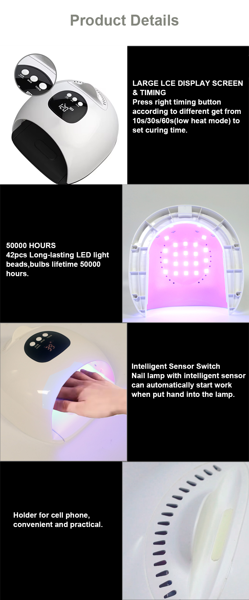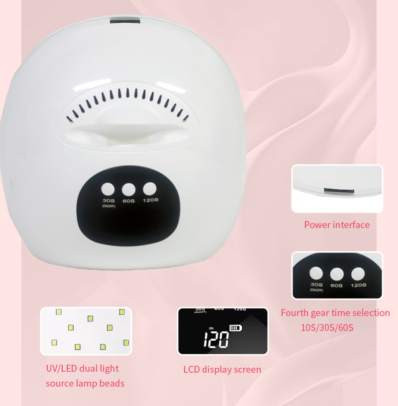 Toode tagab liimi ühtlase kuivamise ilma kokkutõmbumiseta. Selle kaks valgusallikat soojendavad õrnalt, et vältida käte värvimuutust ja silmade väsitamist, mis sobib nii kätele kui jalgadele, pakkudes märkimisväärselt kiireid kuivatustulemusi.