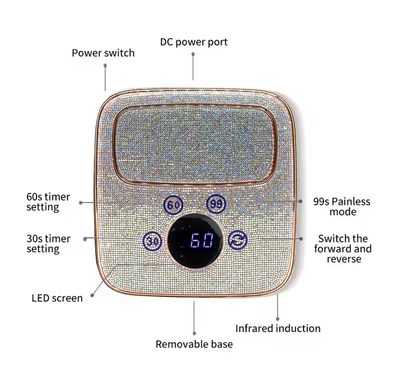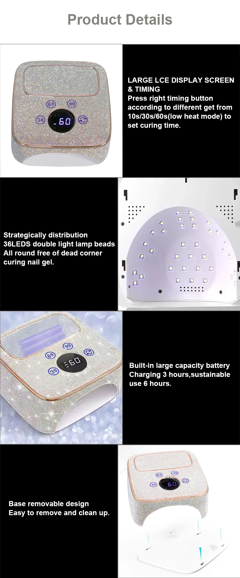 Toode tagab liimi ühtlase kuivamise ilma kokkutõmbumiseta. Selle kaks valgusallikat soojendavad õrnalt, et vältida käte värvimuutust ja silmade väsitamist, mis sobib nii kätele kui jalgadele, pakkudes märkimisväärselt kiireid kuivatustulemusi.
