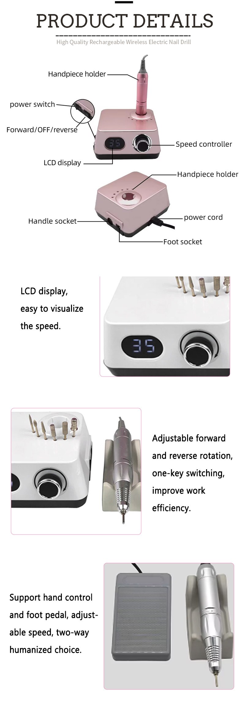 See juhtmevaba elektriline naelatrell 35 000 p/min asendustrelli töömeetodiga, st ühendage ja tõmmake välja, lihtne ja mugav, asendamist saab kasutada pärast lõpetamist.